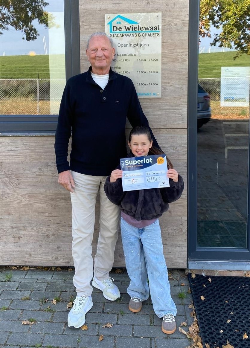 Eliva van de Velde heeft een superlot verkocht aan haar overgrootvader Jan Harkema van De Wielewaal Stacaravans & Chalets.